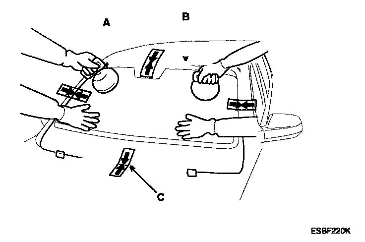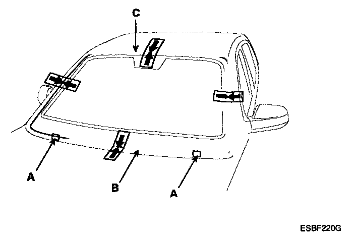 4. Install the spacer (A) install the windshield glass (B) temporarily with marking sure to position them on the center, and then place the alignment mark (C).