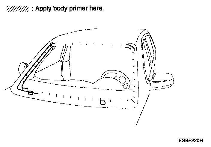 6. With a sponge, apply a light coat of body primer to the original adhesive remaining around the windshield opening flange. Let the body primer dry for at least 10 minutes.