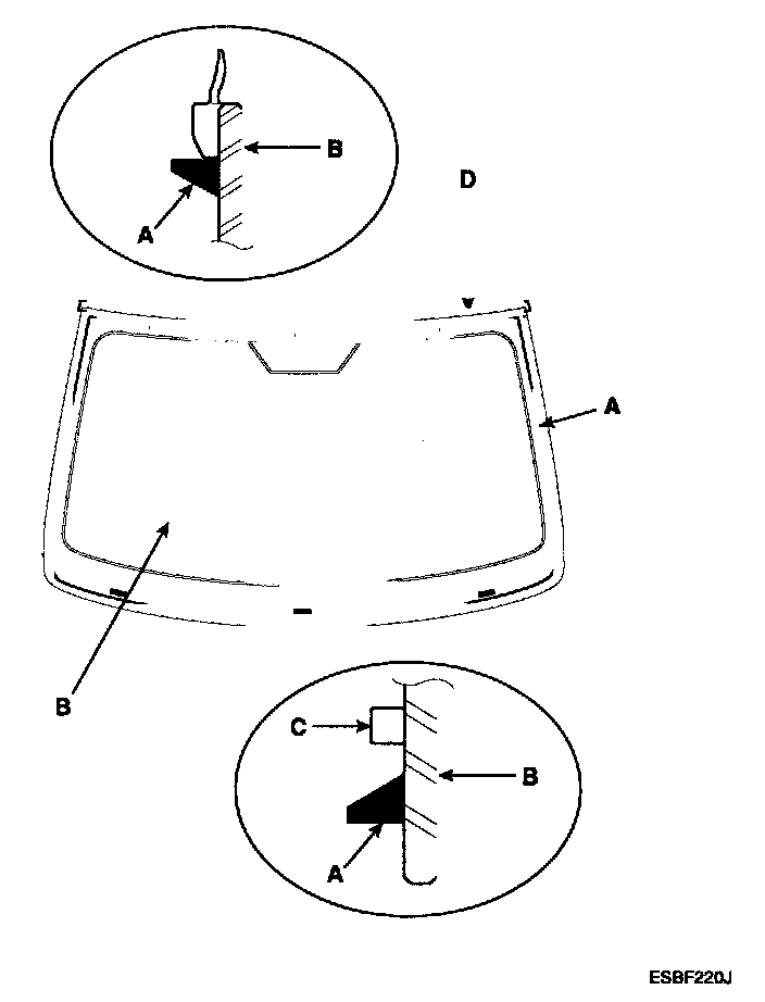 8. Pack adhesive into the cartridge without air pockets to ensure continuous delivery. Put the cartridge in a caulking gun, and run a bead of adhesive (A) around the edge of the windshield (B) between the fastener (C) and molding (D) as shown. Apply the adhesive within 30 minutes after applying the glass primer.