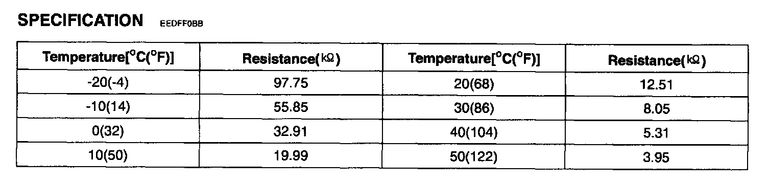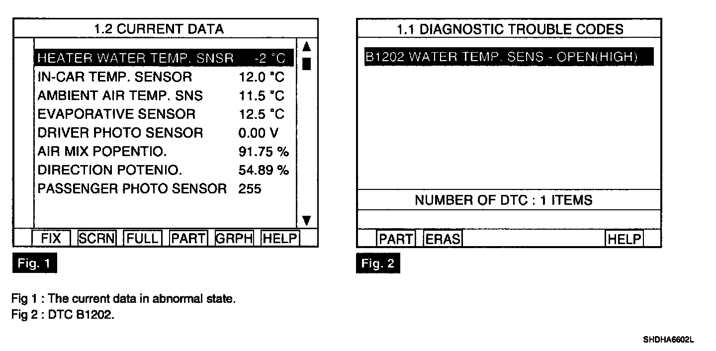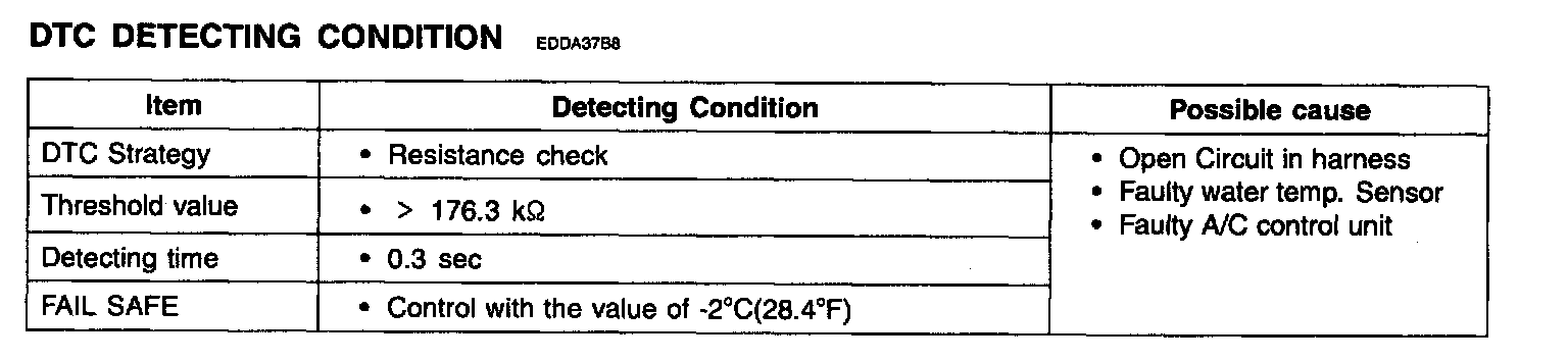 The A/C controller sets DTC B1202 if there is an open circuit in water temp. sensor signal harness or the measured resistance value of the sensor is more than the threshold value (about 176.3 Kohms)