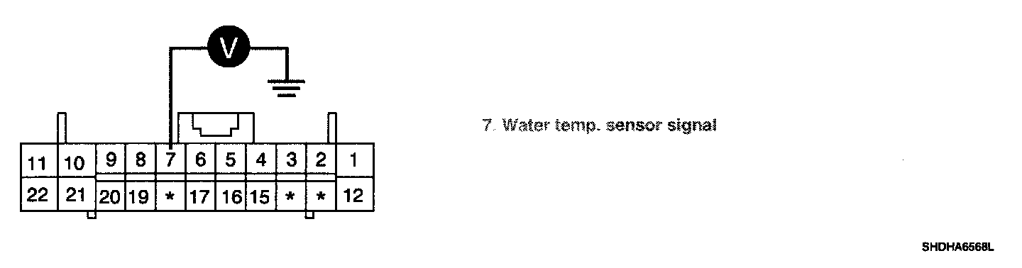 3. Measure resistance between terminal "1" of water temp. sensor and terminal "7" of A/C Control Unit.