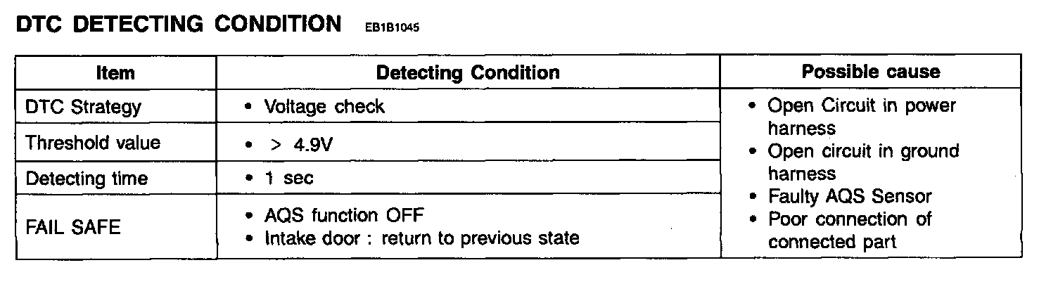 The A/C controller sets DTC B1257 if there is an open circuit in AQS sensor signal harness or the measured voltage value of sensor is more than threshold value.