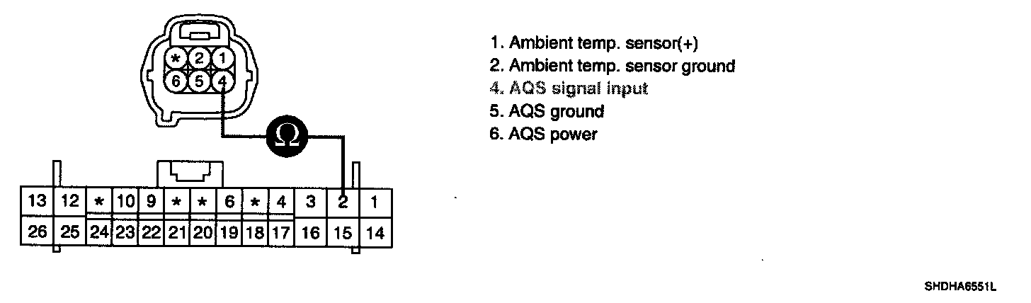 3. Measure resistance between terminal "4" of AQS sensor and terminal "2" of A/C Control Unit.
