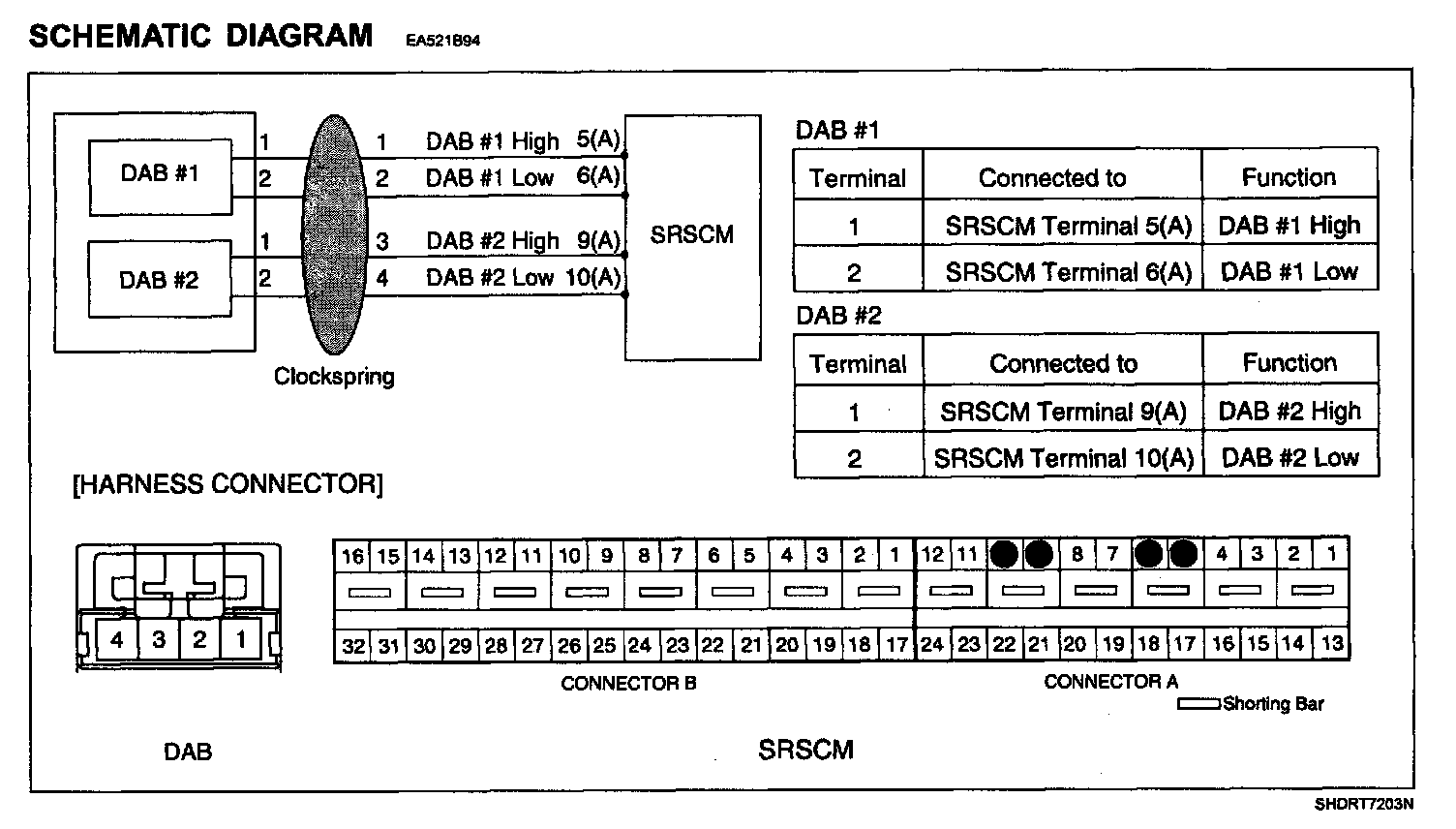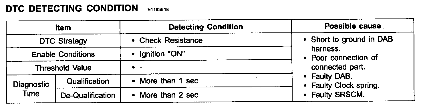 The SRSCM sets DTC B1348 (B1483) if there is a short to ground in DAB harness.