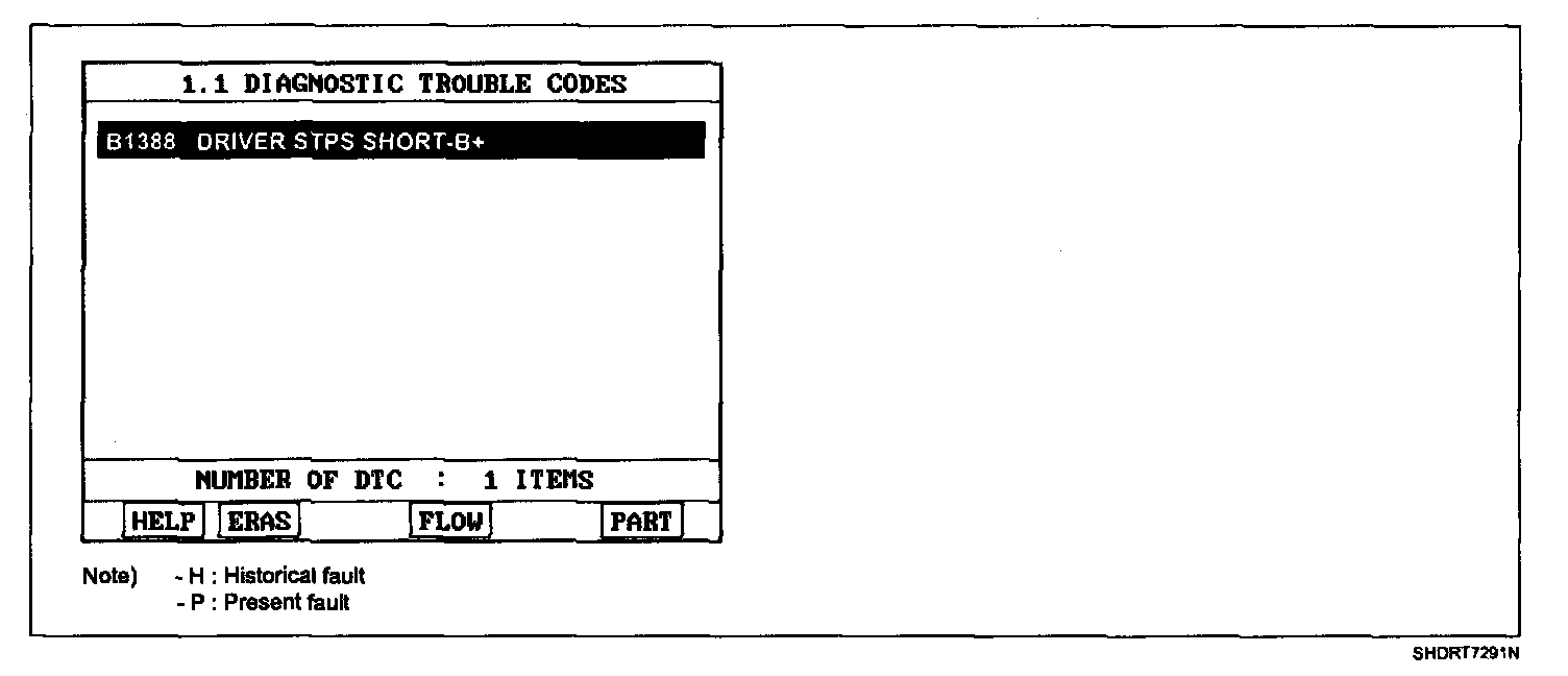 - Displaying nothing (no DTC) or DTC with label "H" (historical) shows that Fault is intermittent caused by poor contact in the part's and/or SRSCM connector or was repaired and SRSCM memory was not cleared.