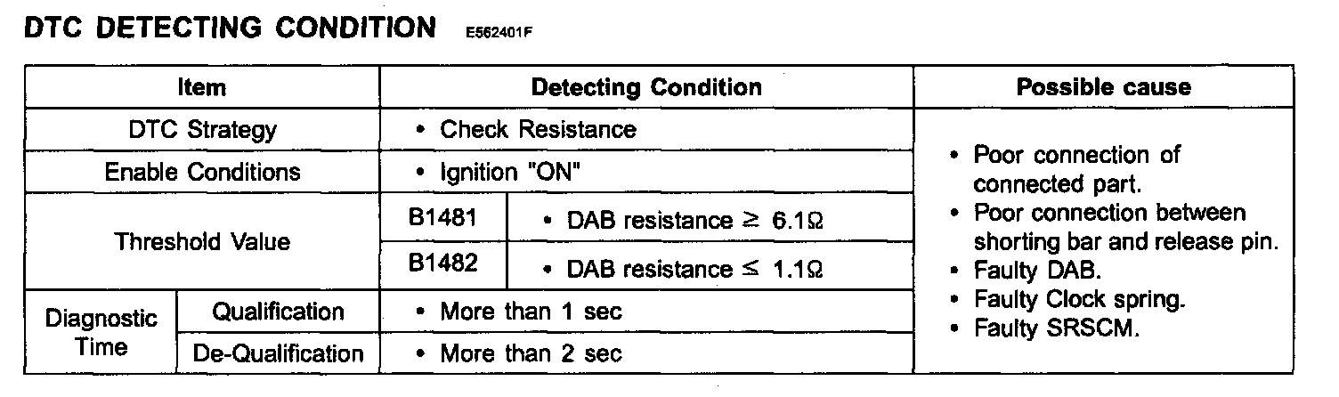 The SRSCM sets DTC B1481 if the measured resistance value of DAB circuit is more than the threshold value.