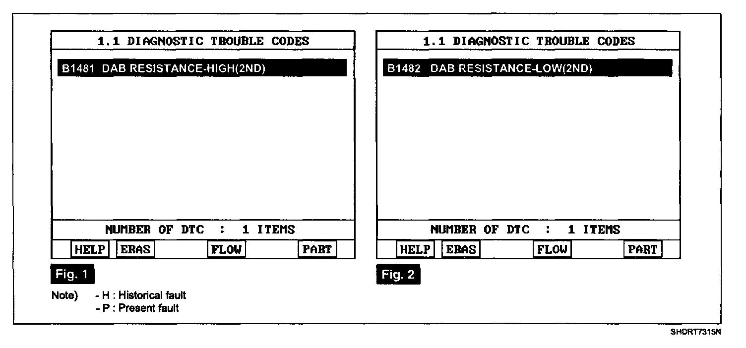 - Displaying nothing (no DTC) or DTC with label "H" (historical) shows that Fault is intermittent caused by poor contact in the part's and/or SRSCM connector or was repaired and SRSCM memory was not cleared.