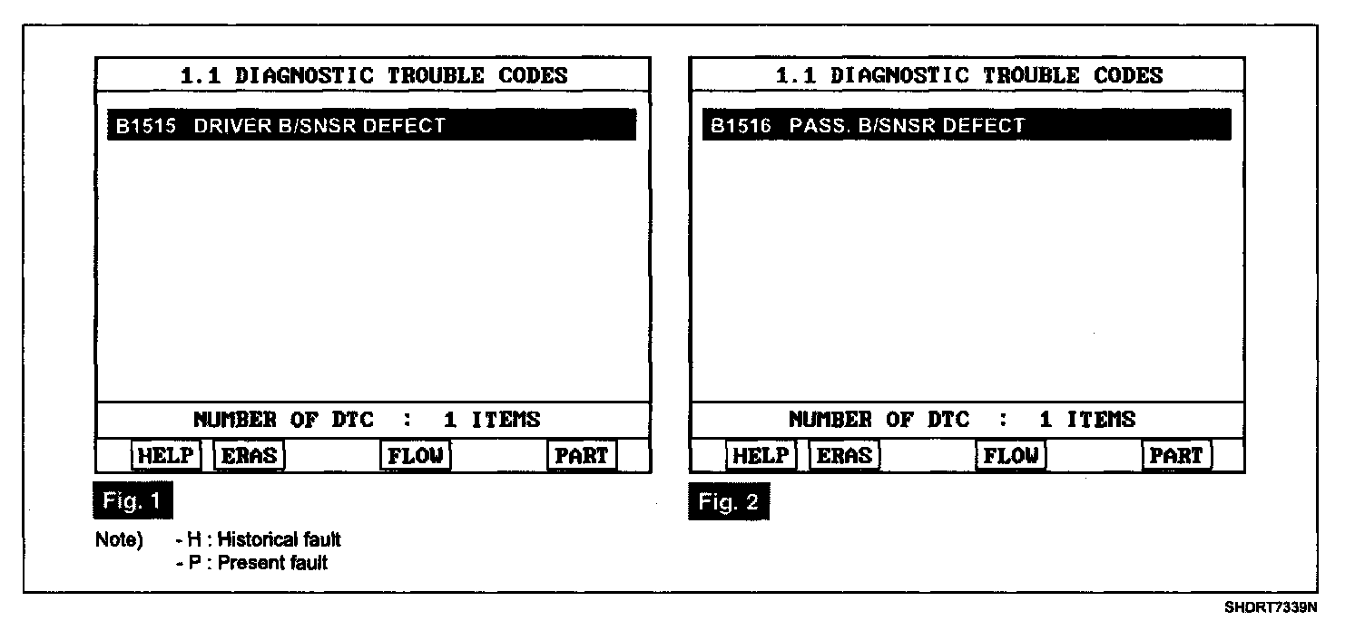 - Displaying nothing (no DTC) or DTC with label "H" (historical) shows that Fault is intermittent caused by poor contact in the part's and/or SRSCM connector or was repaired and SRSCM memory was not cleared.