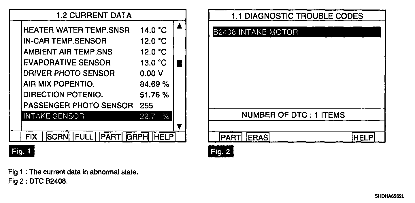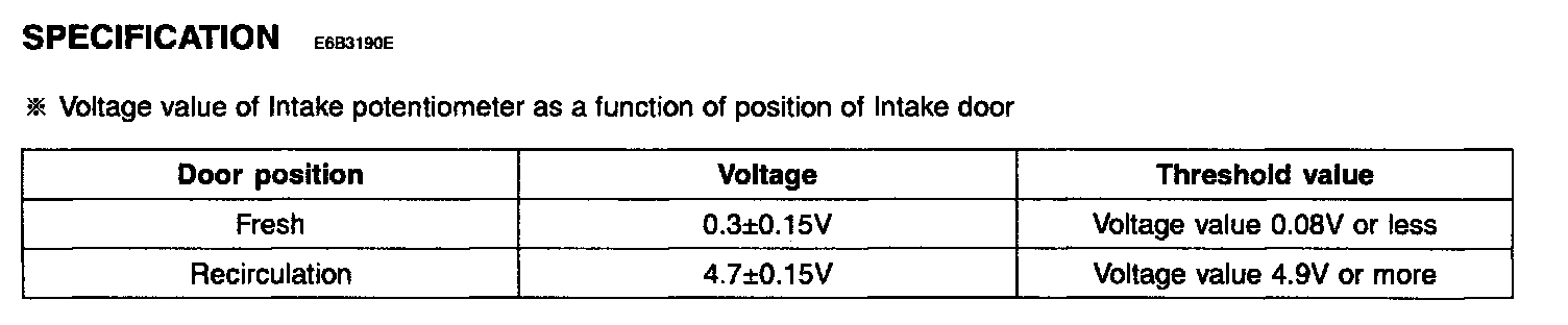 - There is any fault in Intake potentiometer. If the parameter of "Intake potentiometer" is 30% or less when the actuator operates to the fresh position, or If the parameter is 60% and more when the actuator operates to the recirculation position.