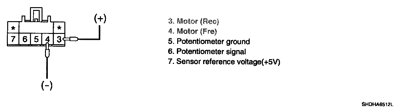 3. Verify that the temperature actuator operates to the fresh position when connecting 12 V to the terminal "3" and grounding terminal "4".