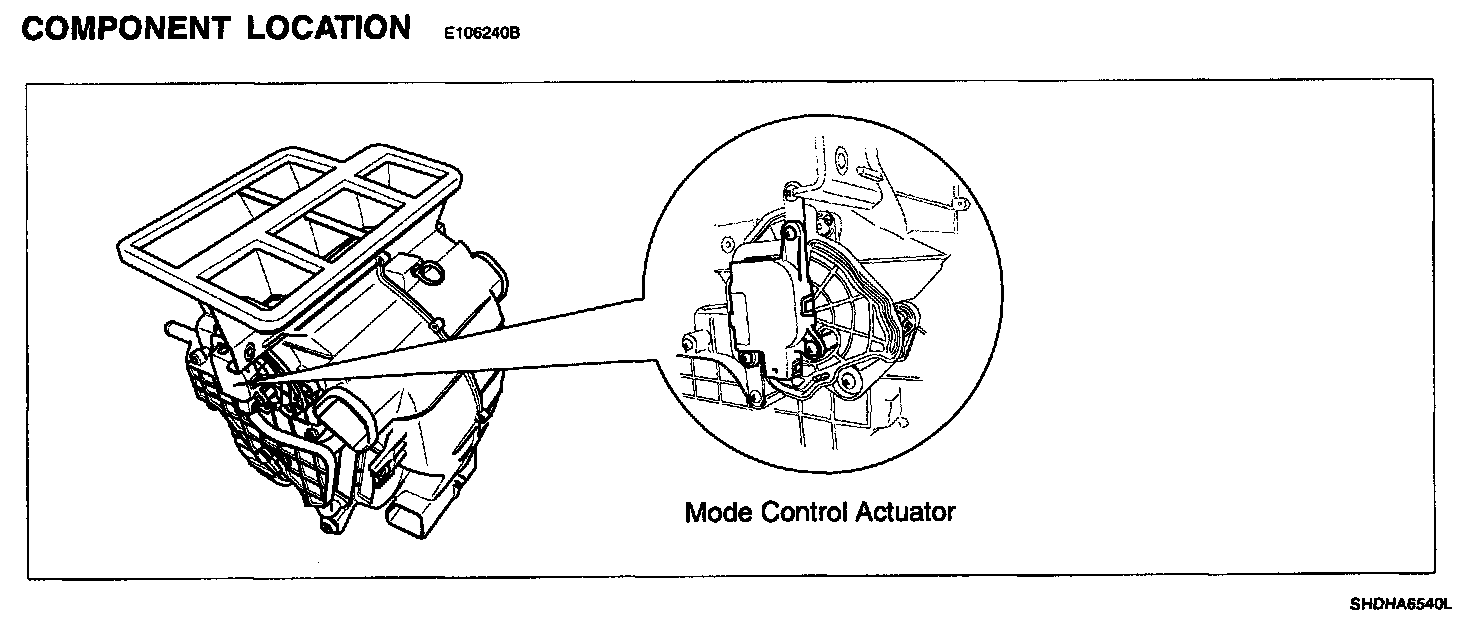 The mode control actuator mounted on heater unit, adjusts position of mode door by operating Direction Motor based on signal of A/C control unit. Pressing mode select switch makes the mode control actuator shift in order of vent-B/L floor -> mix.