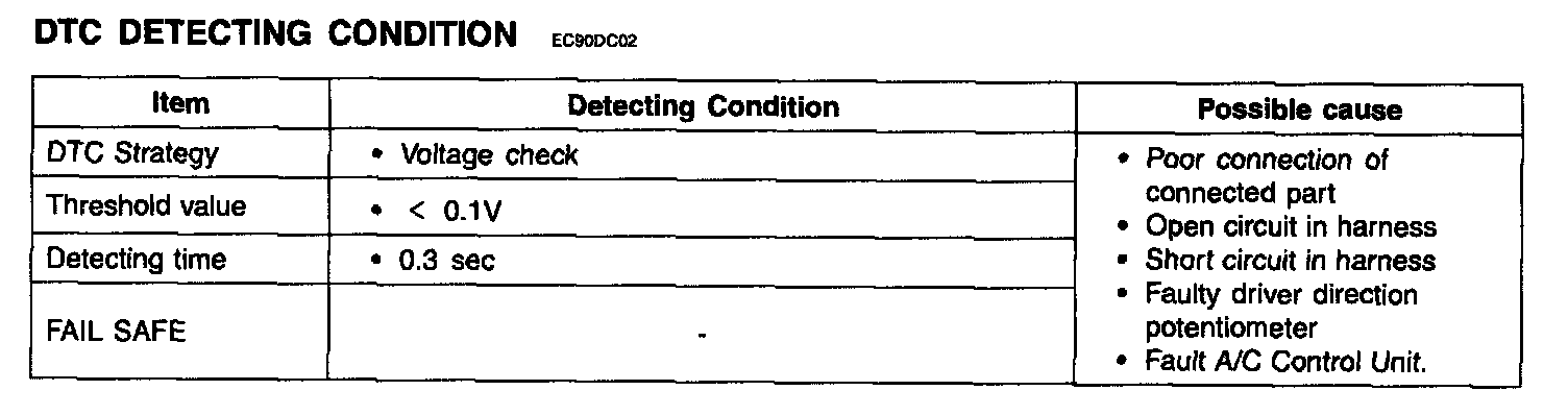- There is any fault in Driver Direction Motor. If the parameter of "Driver DIRECTION POTENTIO." is 10% or less on "VENT" mode, or If the parameter is 90% or more on "DEF" mode.
