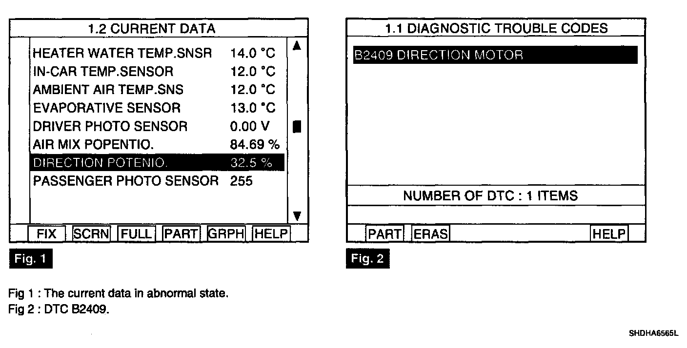 The A/C controller sets DTC B2409 if the direction motor doesn't move to intended position within 40 sec (In this case, A/C controller try to move mode door for 2 sec.. 3 times, every 20 sec. before setting DTC).