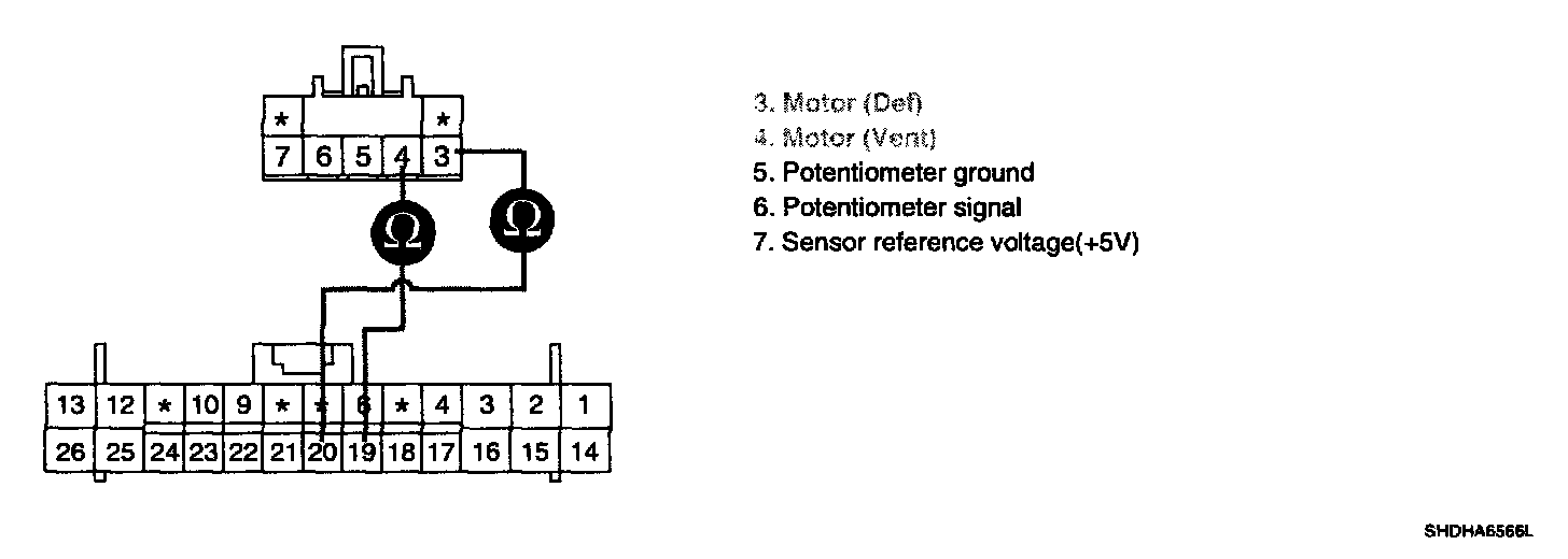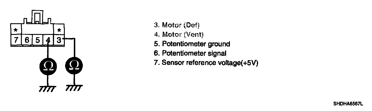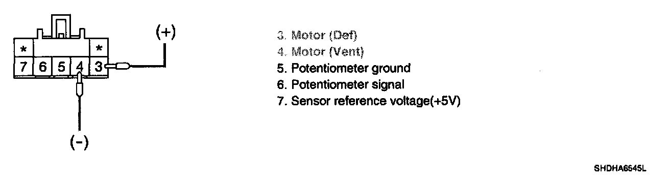 3. Verify that the mode actuator operates to the vent mode when connecting 12 V to the terminal "3" and grounding terminal "4".
