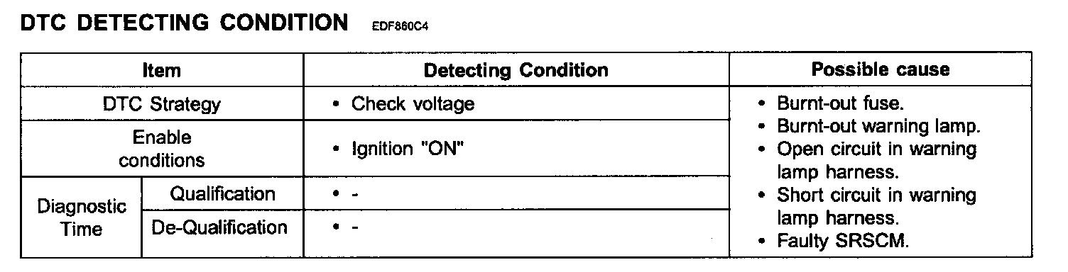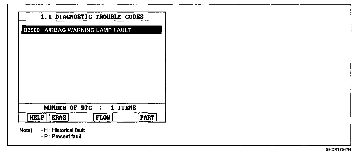 - Displaying nothing (no DTC) or DTC with label "H" (historical) shows that Fault is intermittent caused by poor contact in the part's and/or SRSCM connector or was repaired and SRSCM memory was not cleared.