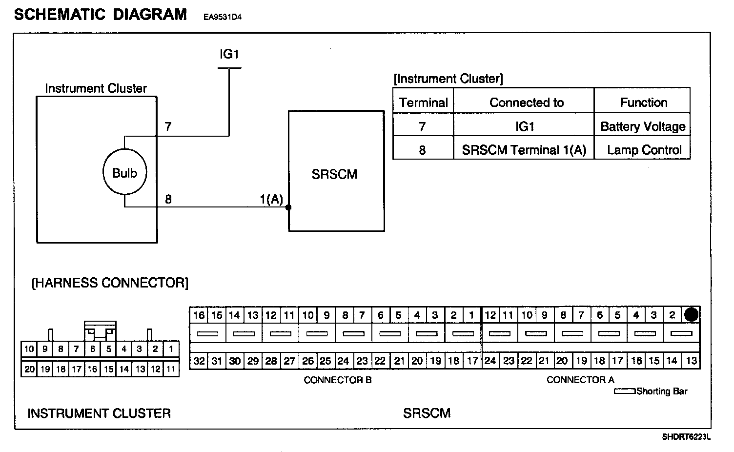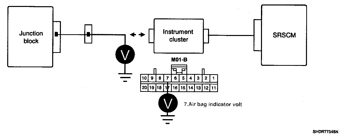 4. Measure voltage between terminal "7" of the Instrument cluster harness connector and chassis ground.