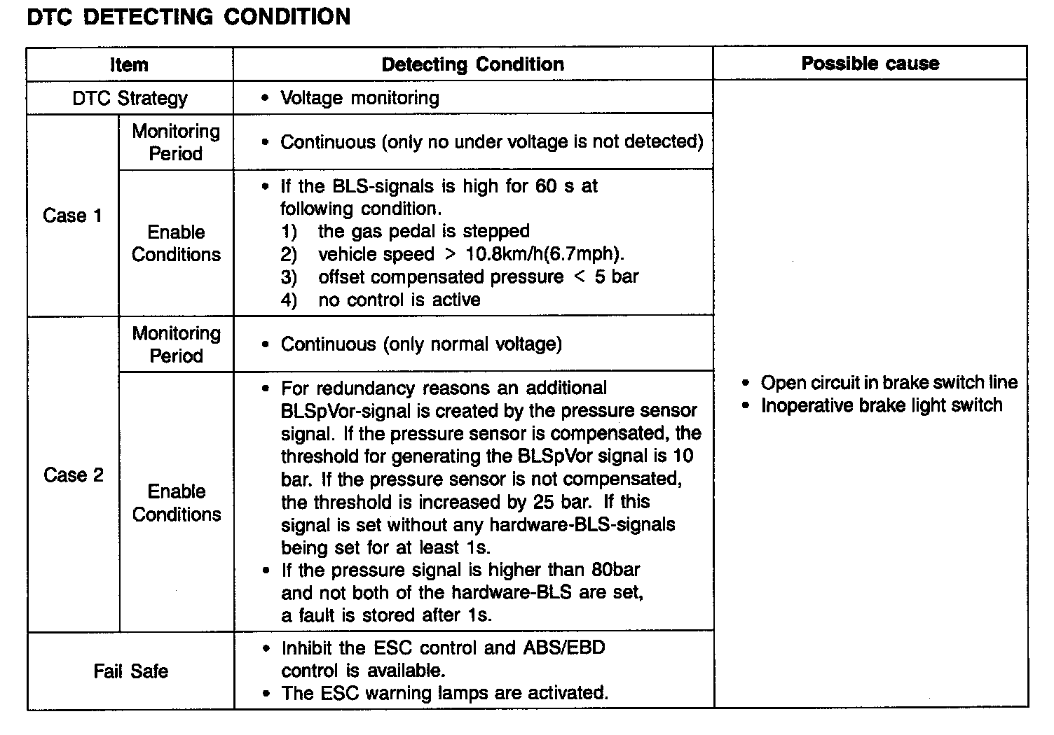 The brake light signal is a reference to judge driver's intention for braking and The HECU checks open or short circuit of brake light switch for normal ABS/ESC control. If an error exists, warning lamp will be turned ON.