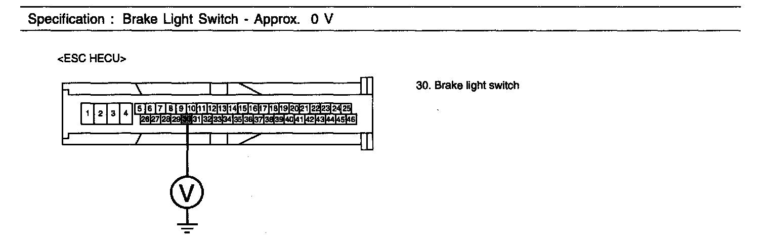 The brake light switch indicates brake pedal status to the ABS control unit. The brake light switch which is dual switch type send brake light signal to HECU. The switch is turned on when brake is depressed. The brake light switch runs to battery voltage when brake depressed. The brake light switch doesn't run to battery voltage when brake is not depressed.