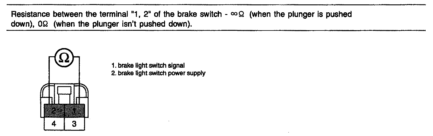 3. Measure resistance between the terminal "1", "2" of the brake switch.