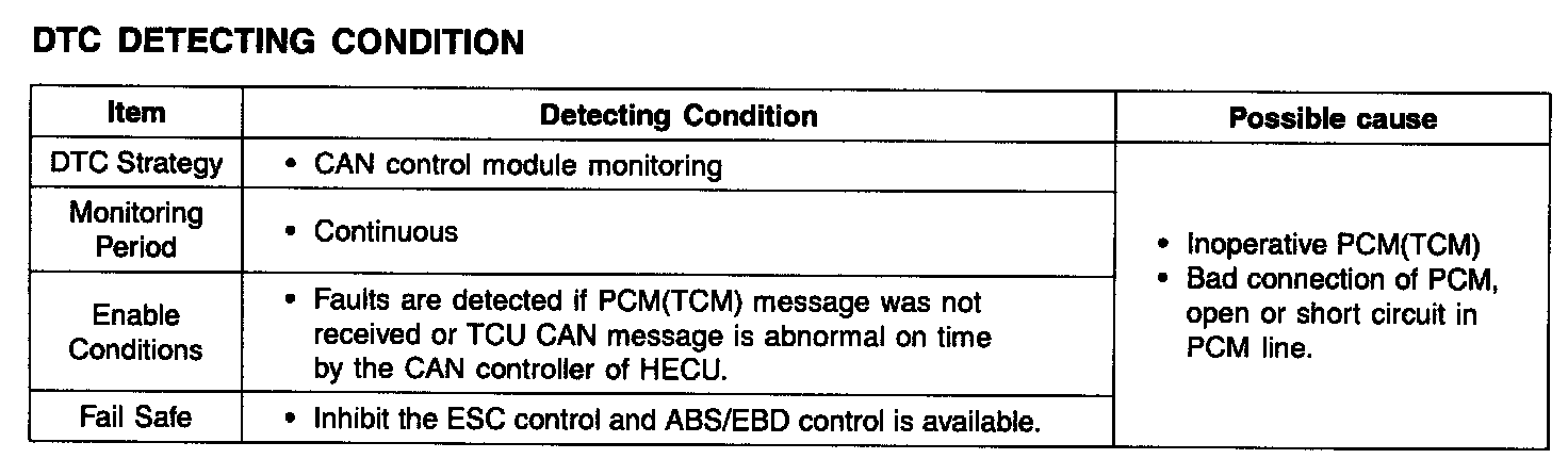 The HECU checks the CAN communication lines for normal TCS control, and sets this code if a PCM (TCM) message is not received within predefined time.