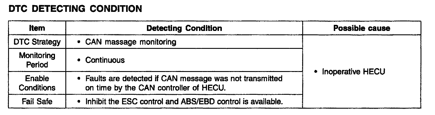 The HECU checks the CAN communication lines for normal ESC control, and sets this code if a CAN message is not transmitted within predefined time.