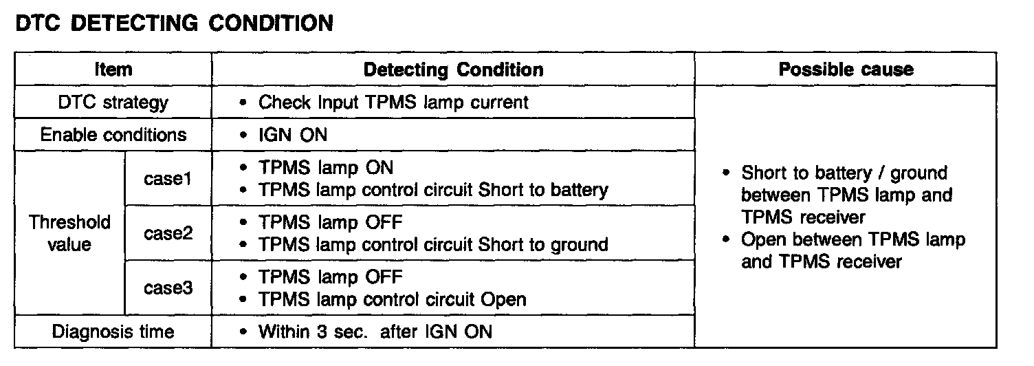 This DTC indicates that the TPMS lamp control circuit short to battery when lamp is on. -OR- TPMS lamp control circuit short to ground or open when lamp is off.
