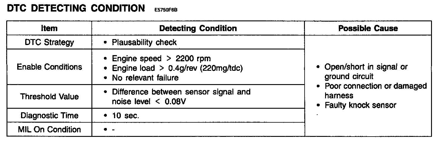 The ECM monitors the range of the analog input signal from knock sensor to check sensor failure that is short circuit or open circuit. If the difference between knock signal and noise level is smaller than the threshold during defined time period. the DTC P0325 is set. In case the noise level is higher than the upper threshold or lower than the lower threshold, the DTC P0325 is set too.