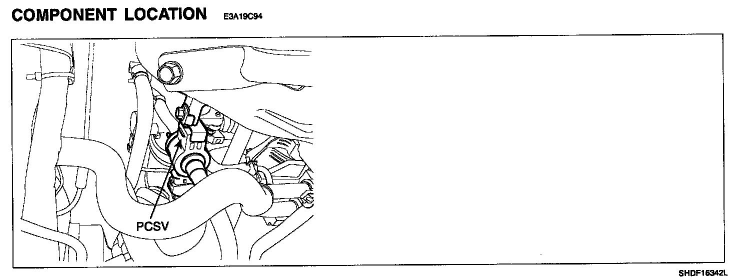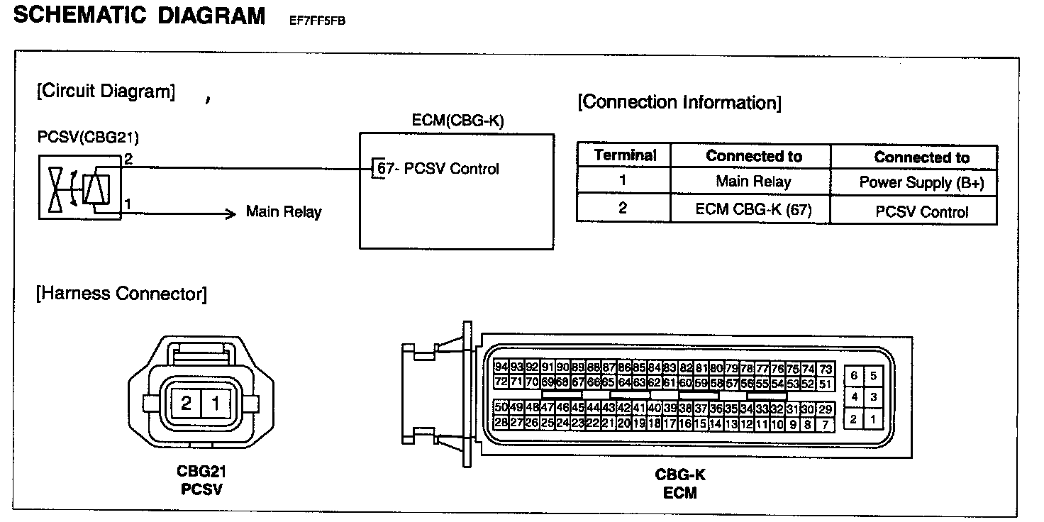 The evaporative emission control system prevents hydrocarbon (HC) vapors from the fuel tank from escaping into the atmosphere where they could form photochemical smog. Gasoline vapors are collected in the charcoal canister. The ECM controls the Purge Control Solenoid Valve (PCSV) to purge any collected vapors from the canister back to the engine for combustion. This valve is actuated by the purge control signal from the ECM and controls fuel vapor from the canister to the intake manifold.
