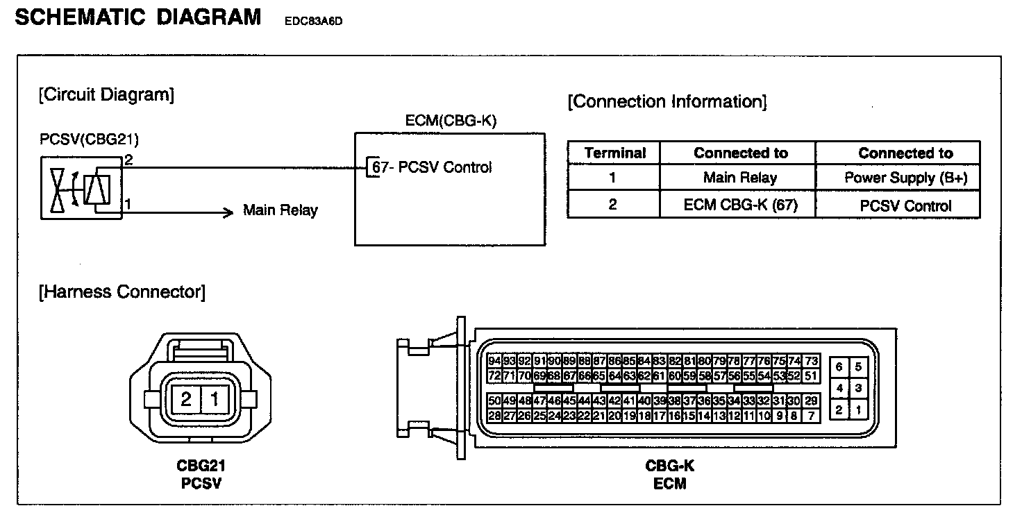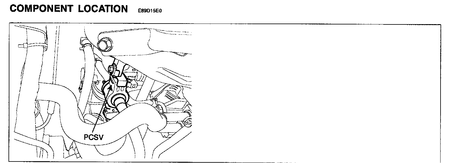 The evaporative emission control system prevents hydrocarbon (HC) vapors from the fuel tank from escaping into the atmosphere where they could form photochemical smog. Gasoline vapors are collected in the charcoal canister. The ECM controls the Purge Control Solenoid Valve (PCSV) to purge any collected vapors from the canister back to the engine for combustion. This valve is actuated by the purge control signal from the ECM and controls fuel vapor flow from the canister to the intake manifold.