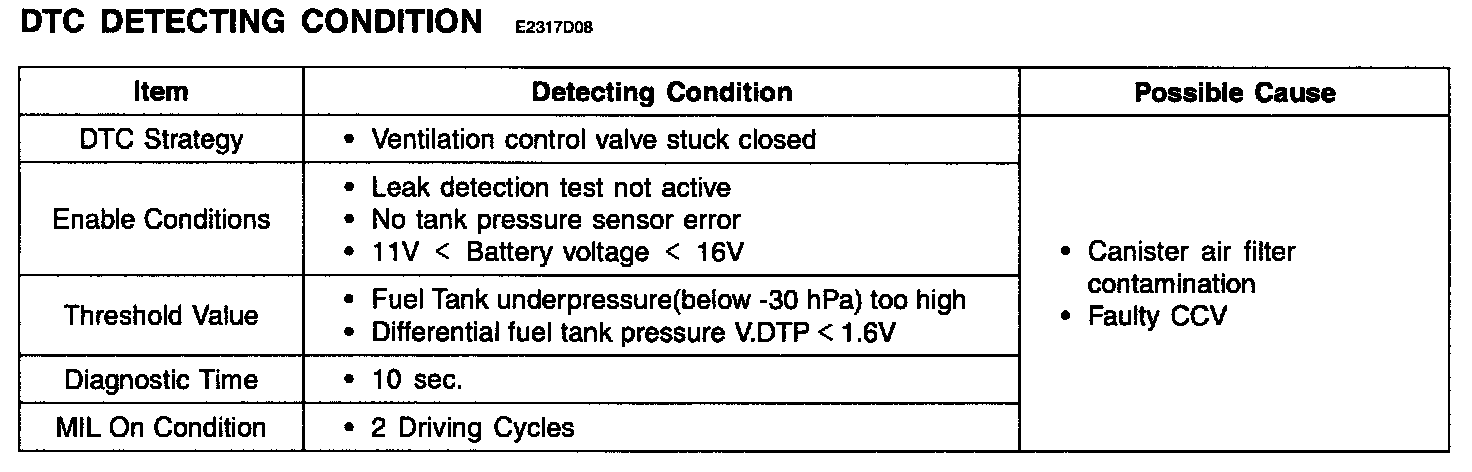 The ECM measures pressure in the fuel tank by means of tank pressure sensor during all engine operating states except engine stop and start. ECM sets DTC P0449 if the ECM detects that the fuel tank pressure is too low as a result of the stuck closed CCV. And the same error code is set in the next driving cycle, the ECM illuminates the MIL.