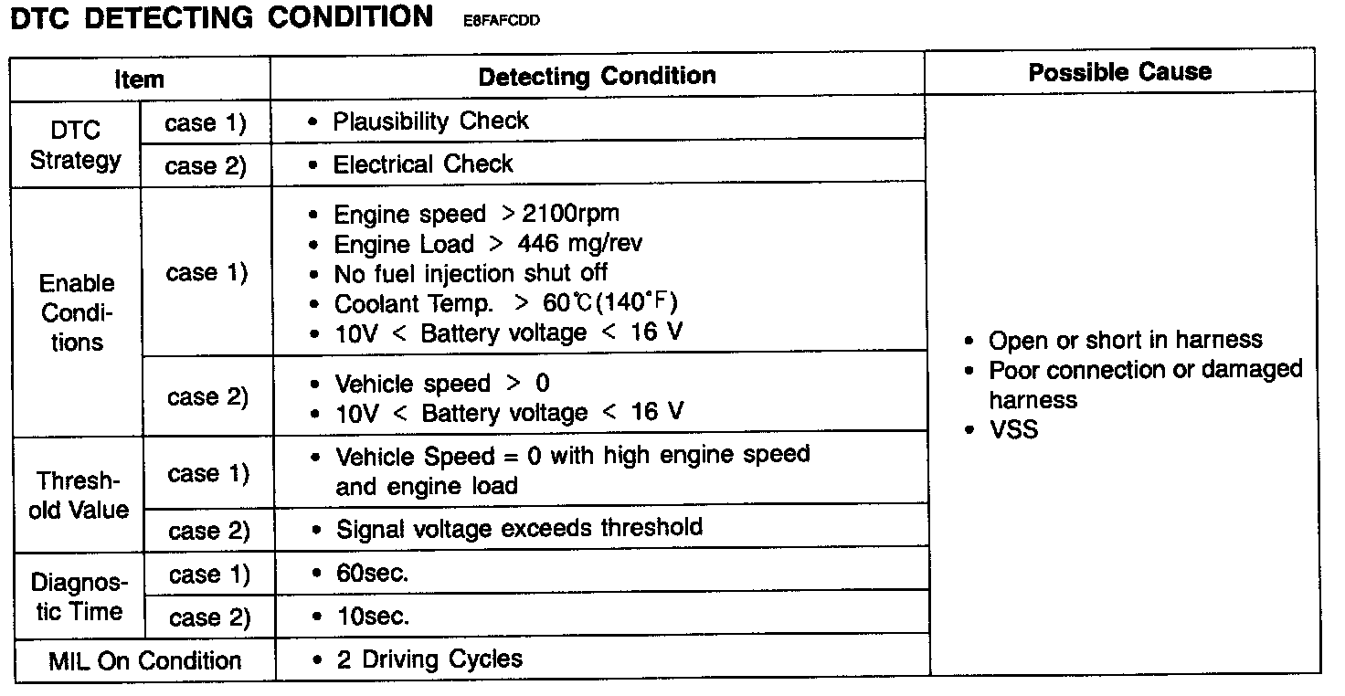 The ECM evaluates engine speed and mass air flow if there is no vehicle speed signal. This evaluation of both values will detect open circuit or short circuit errors on the wheel speed sensor. The ECM sets DTC P2159 if there is no vehicle speed signal from wheel speed sensor while both engine speed and mass air flow are higher than predetermined threshold during the predetermined time