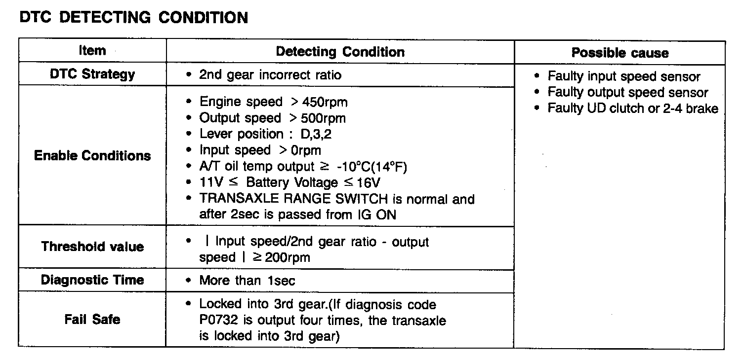 This code is set if the value of input shaft speed is not equal to the value of the output shaft, when multiplied by the 2nd gear ratio, while the transaxle is engaged in 2nd gear. This malfunction is mainly caused by mechanical troubles such as control valve sticking or solenoid valve malfunctioning rather than an electrical issue.