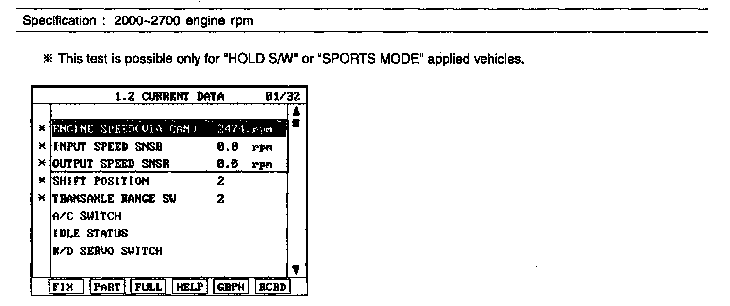 6. If carrying out the stall test two or more time, move the select lever to the "N" position and run the engine at 1,000 rpm to let the A/T fluid cool down before carrying out subsequent.