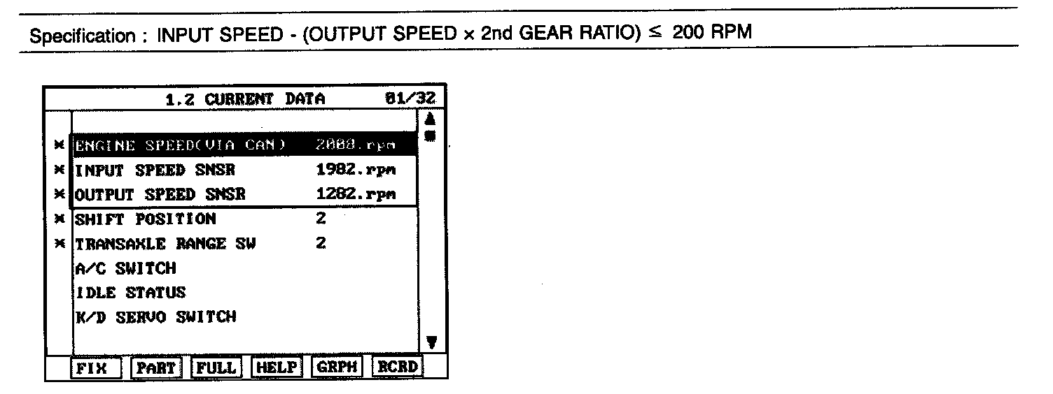 The value of the input shaft speed should be equal to the value of the output shaft speed, when multiplied by the 2nd gear ratio, while the transaxle is engaged in the 2nd gear. For example, if the output speed is 1000 rpm and the 2nd gear ratio is 1.529, then the input speed is 1,592 rpm.