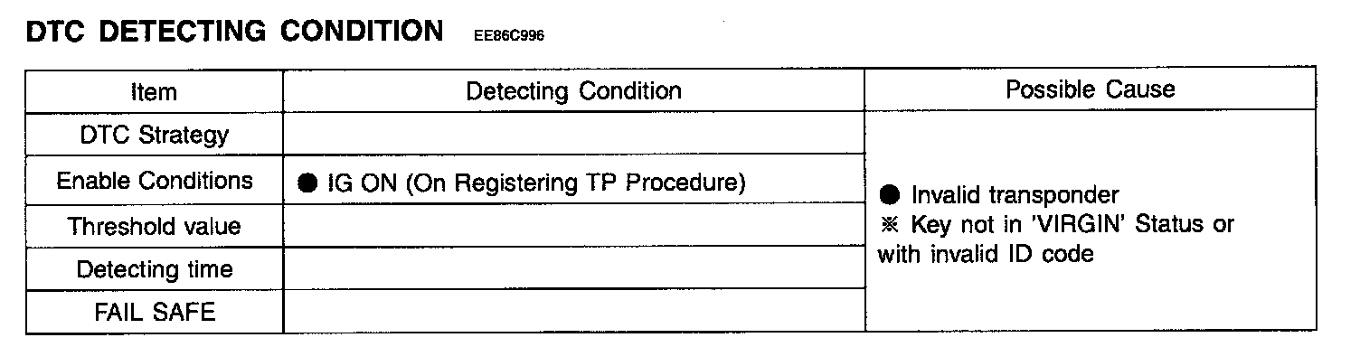 The ECM sets DTC P1674 if transponder key that can't be register (TP not in the password mode or whose transport data has been changed) is inserted for registration procedure.