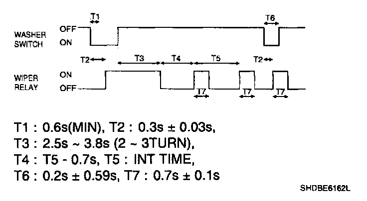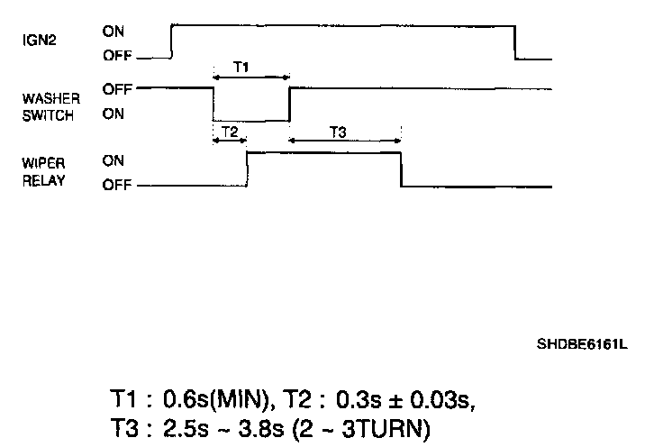 1. Under IGN2 SW ON, WIPER RELAY is turned ON after T2 from WASHER SW ON if WASHER SW is ON for T1 .and WIPER RELAY is turned OFF after T3.