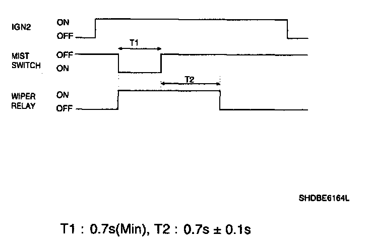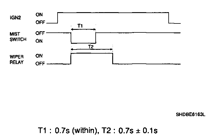 1. Under IGN2 SW ON, WIPER RELAY is turned ON directly from MIST SW ON if MIST SW is ON for T1 and WIPER RELAY is turned OFF after T2.