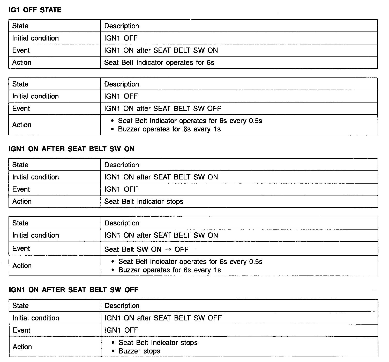 1. Seat belt indicator and BUZZER every 1 sec for 6 sec when IGN is ON.