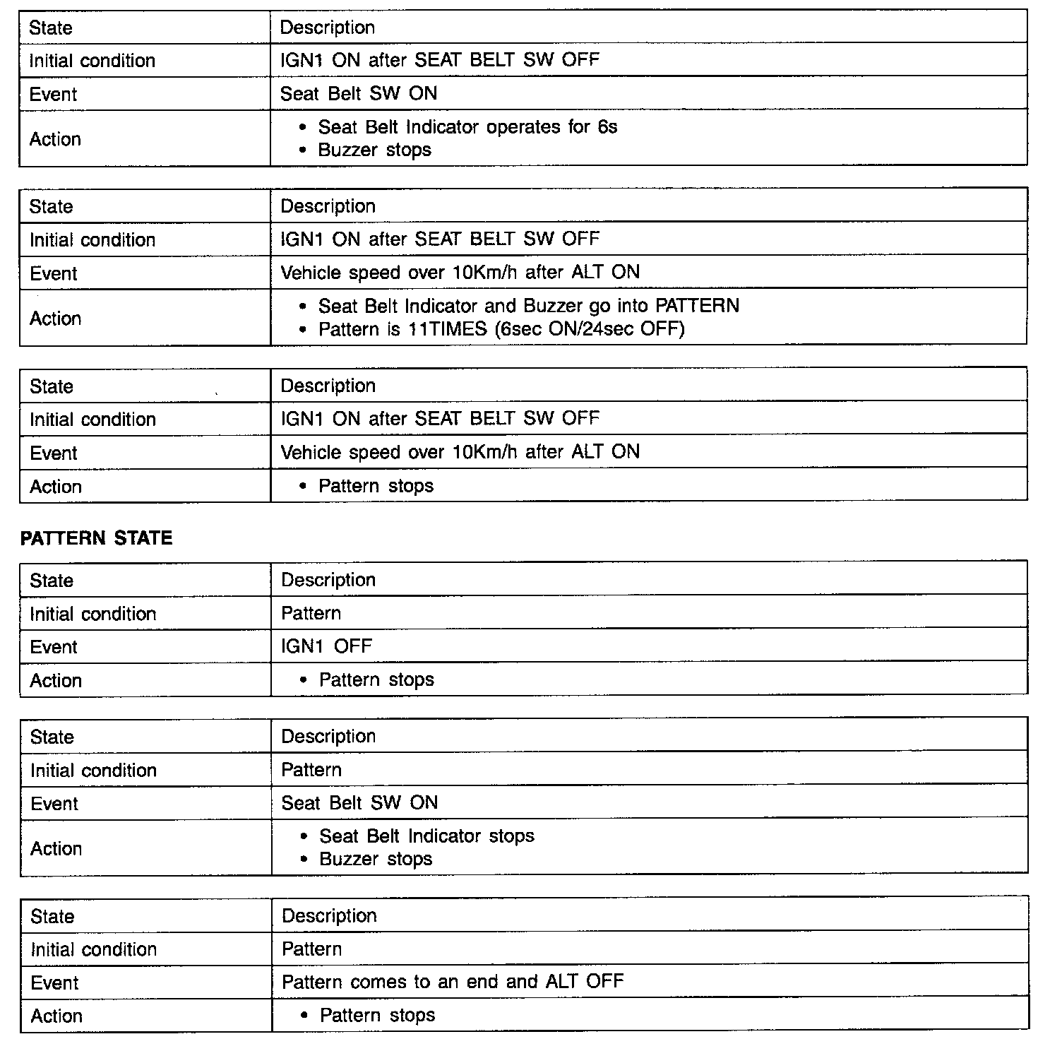 3. IF vehicle speed over 10 Km/h, SEAT BELT WARNING LAMP and CHIME BUZZER are Work for PATTERN 1 TIME when SEAT BELT unfastened after IGN ON/ALT "L" ON.