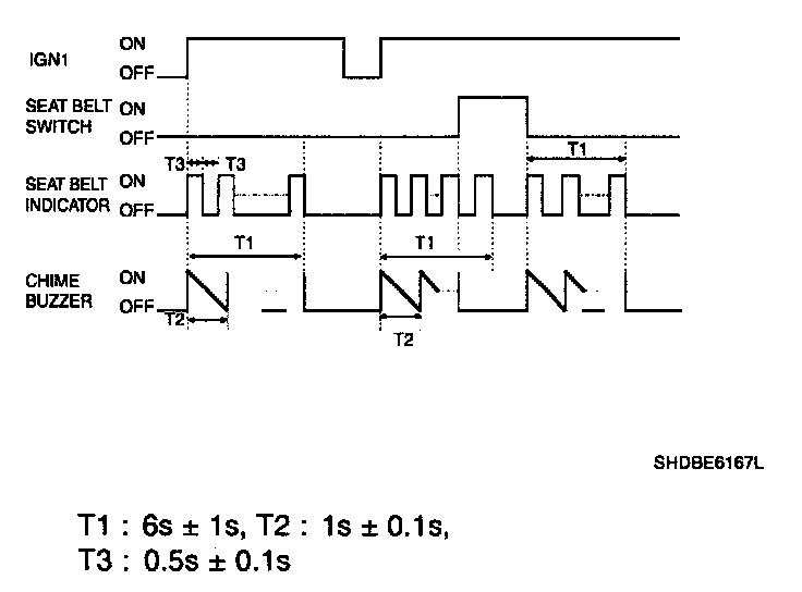 1. From IGN1 SW ON, SEAT BELT WARNING LAMP lights for 6 s every 0.5 s and CHIME BUZZER sounds for 6 s every 1 s (in case of SEAT BELT unfastened state)