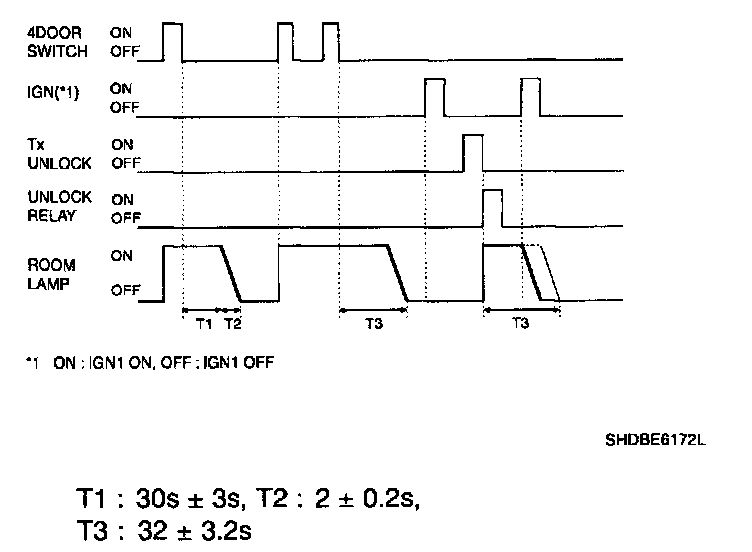 7. ROOM LAMP is turned ON for T3 when Tx UNLOCK signal is received under DOOR CLOSE. ROOM LAMP signal output is extended for T3 if Tx UNLOCK signal is received under ON state. The lamp lights continuously at DOOR OPEN under ON state. Operation in (1) is performed at DOOR CLOSE. ROOM LAMP signal is turned OFF at ALL DOOR LOCK during ROOM LAMP ON. (phasing out for 2 sec).