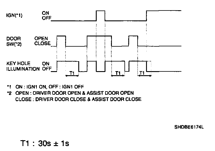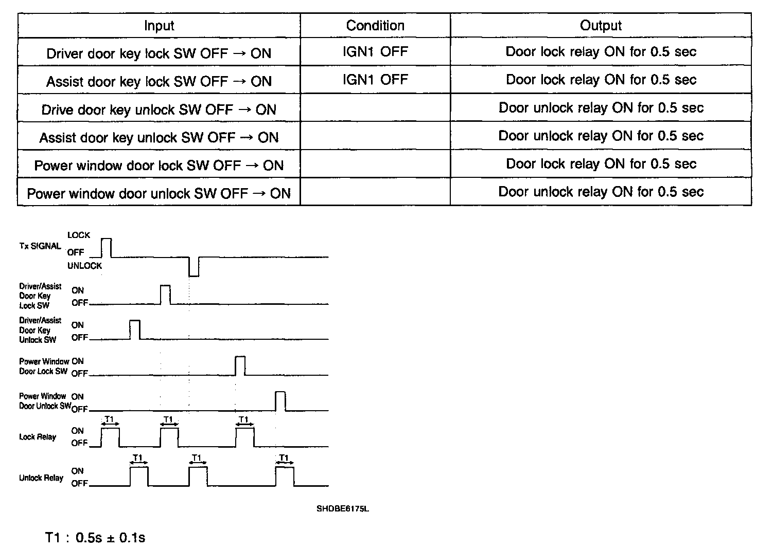 1. ALL DOOR LOCK signal is output for T1 (0.5 s) if Driver/Assist door key LOCK SW is turned ON.