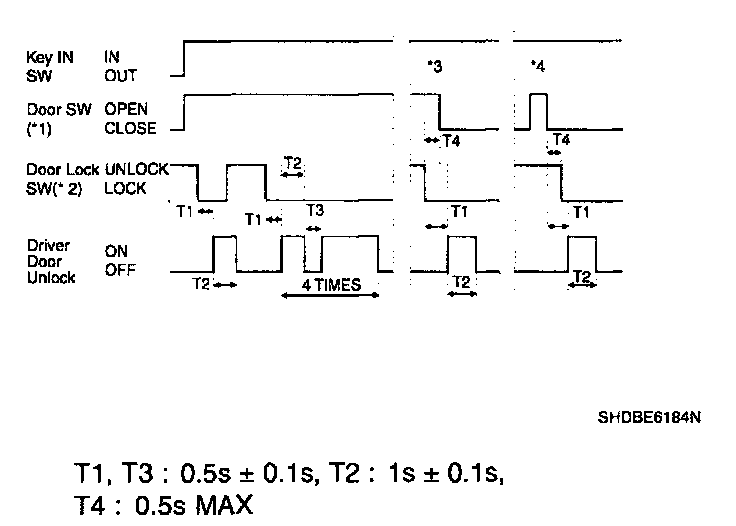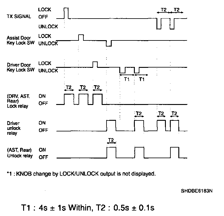 1. All DOOR UNLOCK (DR, AS, RR) signals are output for T2 if DRIVER DOOR KEY UNLOCK SW is turned ON within T1 after changing DR DOOR KEY UNLOCK SW from OFF to ON (mechanically. DRIVER DOOR LOCK SW is unlocked and BCC signal is not output). ALL DOOR UNLOCK (DR, AS, RR) signals are output even within T1 after TX UNLOCK signal is received.)