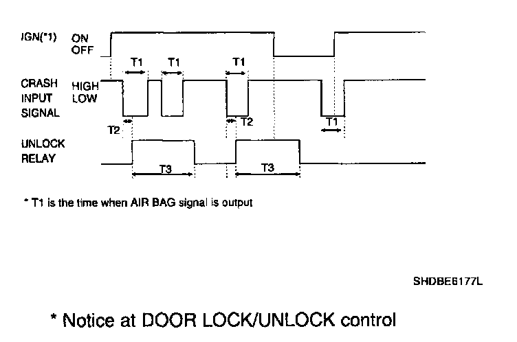 6. CENTRAL DOOR LOCK function is not performed during or after CRASH UNLOCK signal output. But, CENTRAL DOOR LOCK function is performed normally if CRASH UNLOCK function is reset after IGN OFF.