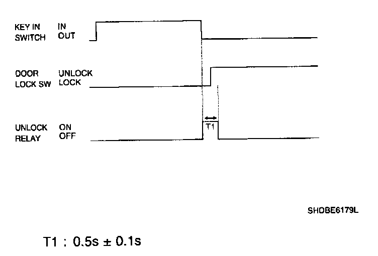 2. Driver DOOR UNLOCK signals are output for 1 s after 0.5 s from when the state becomes KEY IN SW IN and Driver DOOR OPEN and Driver DOOR LOCK SW LOCK