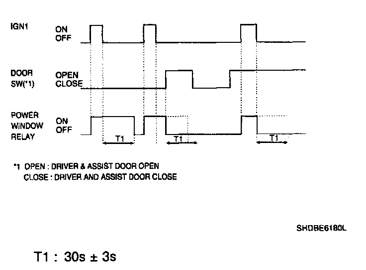 3. P/WINDOW RELAY is immediately turned OFF if DOOR is opened under P/WINDOW RELAY ON for T1.