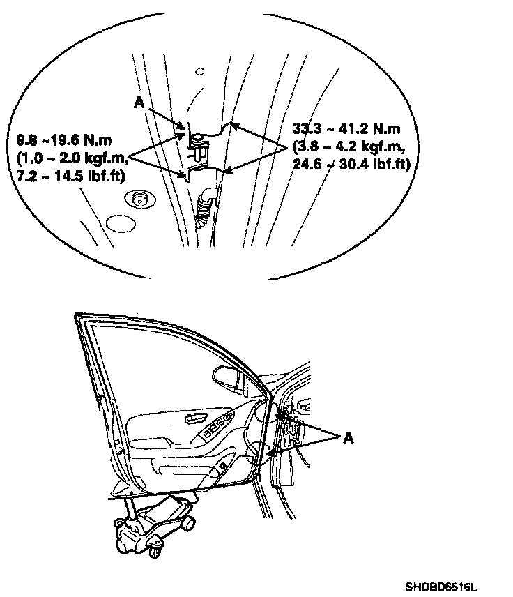 - Loosen the door mounting bolts (B) slightly, and move the door IN or OUT until it aligns flush with the body.
