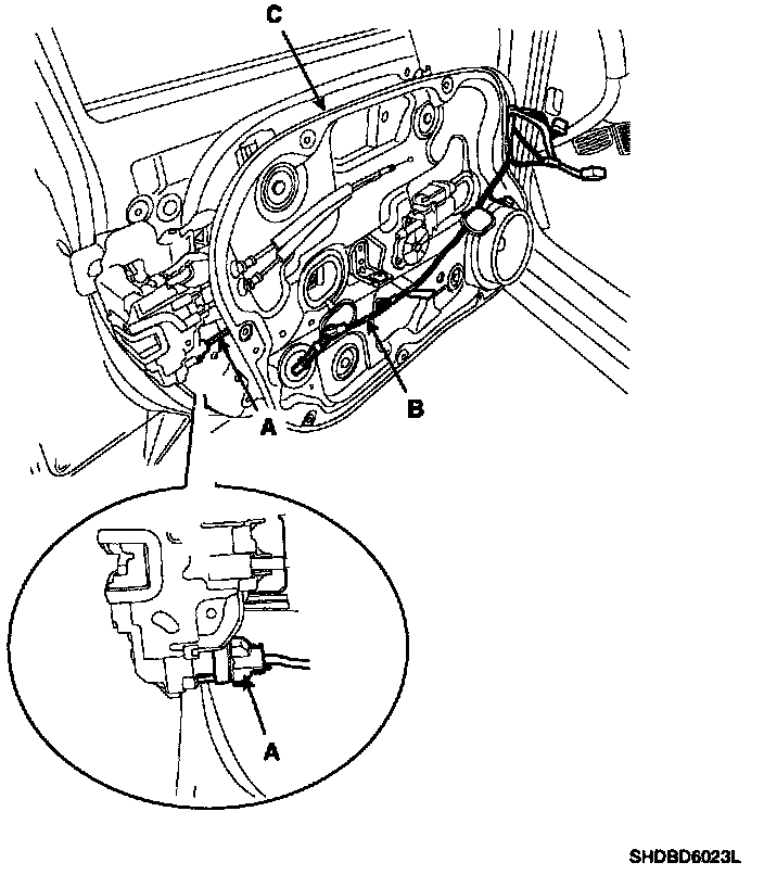 5. Disconnect the door module wiring harness (B), then remove the module assembly (C).