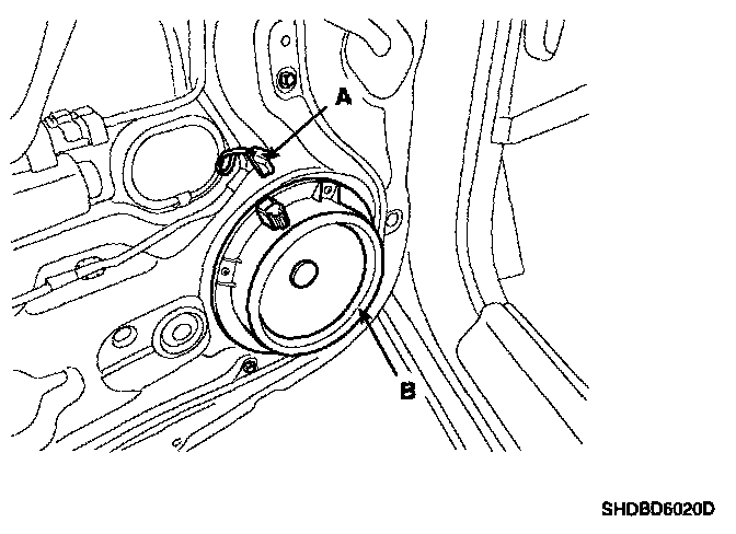 2. Drill out the rivets to remove the speaker (B) from the door module.