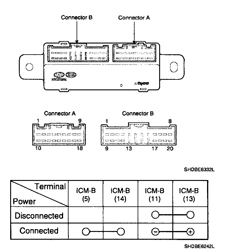 4. There should be continuity between the No.4 terminal and No.14 terminal in the ICM-B when power and ground are connected to the No.10 terminal and No.13 terminal in the ICM-B.